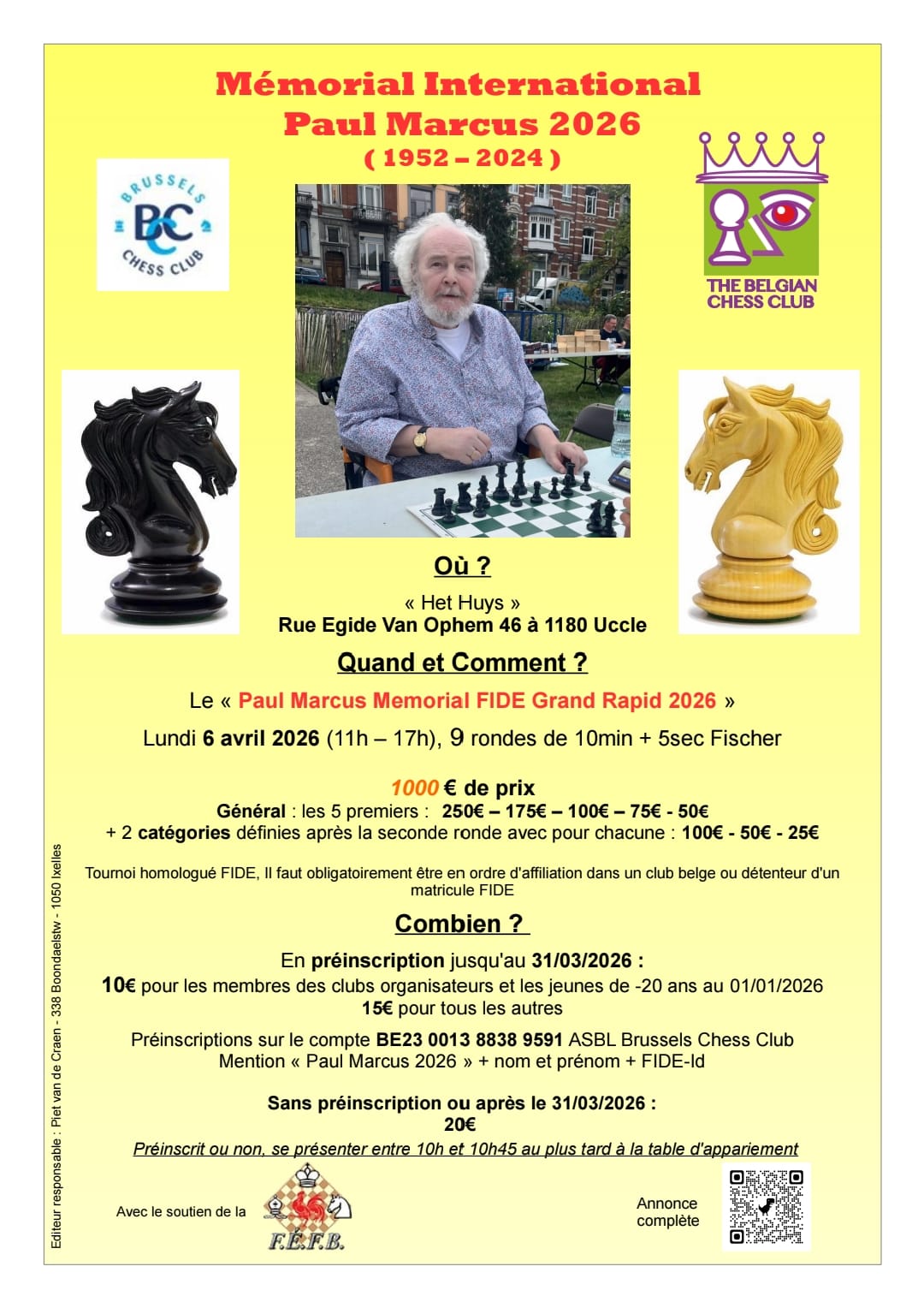 The Belgian Chess Club - son club de cœur - et le Brussels Chess Club - son club d'adoption - ont, avec le soutien de sa veuve Madame Anne-Marie Lauwereins et sa fille Morgane, le plaisir d'honorer à nouveau la mémoire de notre ami à tous Monsieur Paul Marcus en organisant le