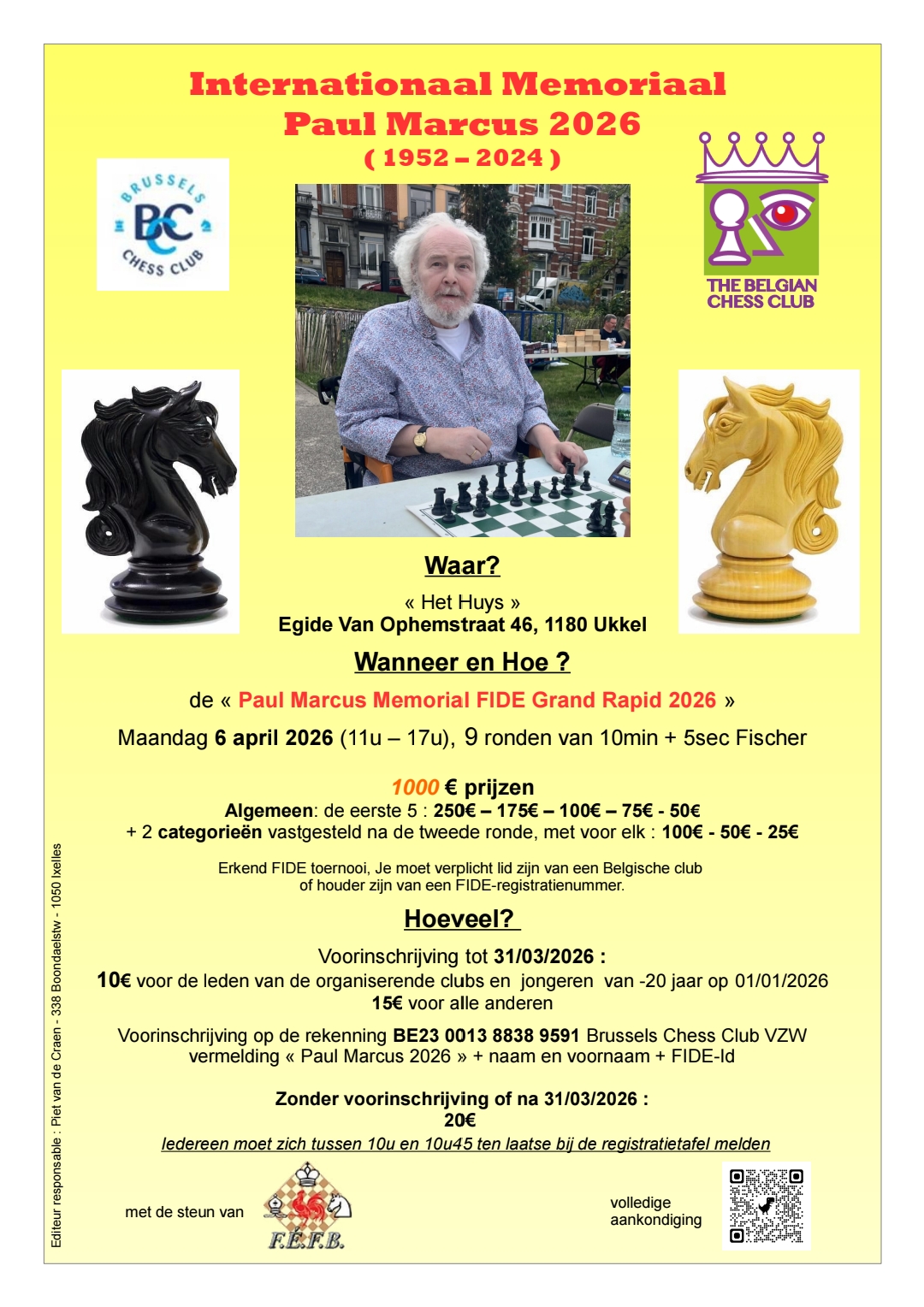 The Belgian Chess Club - de club van zijn hart - en de Brussels Chess Club – zijn adoptieclub – met steun van zijn weduwe Mevrouw Anne-Marie Lauwereins en haar dochter Morgane, hebben de eer en het genoegen opnieuw de herinnering aan onze vriend de heer Paul Marcus levendig te houden met de organisatie van de